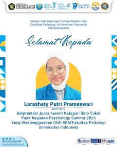 Berprestasi Juara Favorit Kategori Solo Vokal pada kegiatan Psychology Summit 2025 yang diselenggarakan oleh BEM Fakultas Psikologi Universitas Indonesia