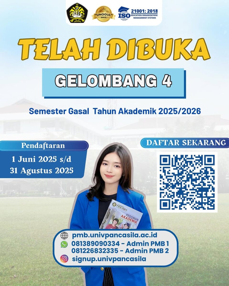 TELAH DIBUKA! GELOMBANG 4 PENDAFTARAN MAHASISWA BARU Periode: 1 Juni – 31 Agustus 2025 Jangan lewatkan kesempatan untuk bergabung di Universitas Pancasila, kampus unggulan dengan akreditasi “Unggul” dan sistem pendidikan berbasis mutu berstandar internasional (ISO 21001:2018). Daftar sekarang di: pmb.univpancasila.ac.id …