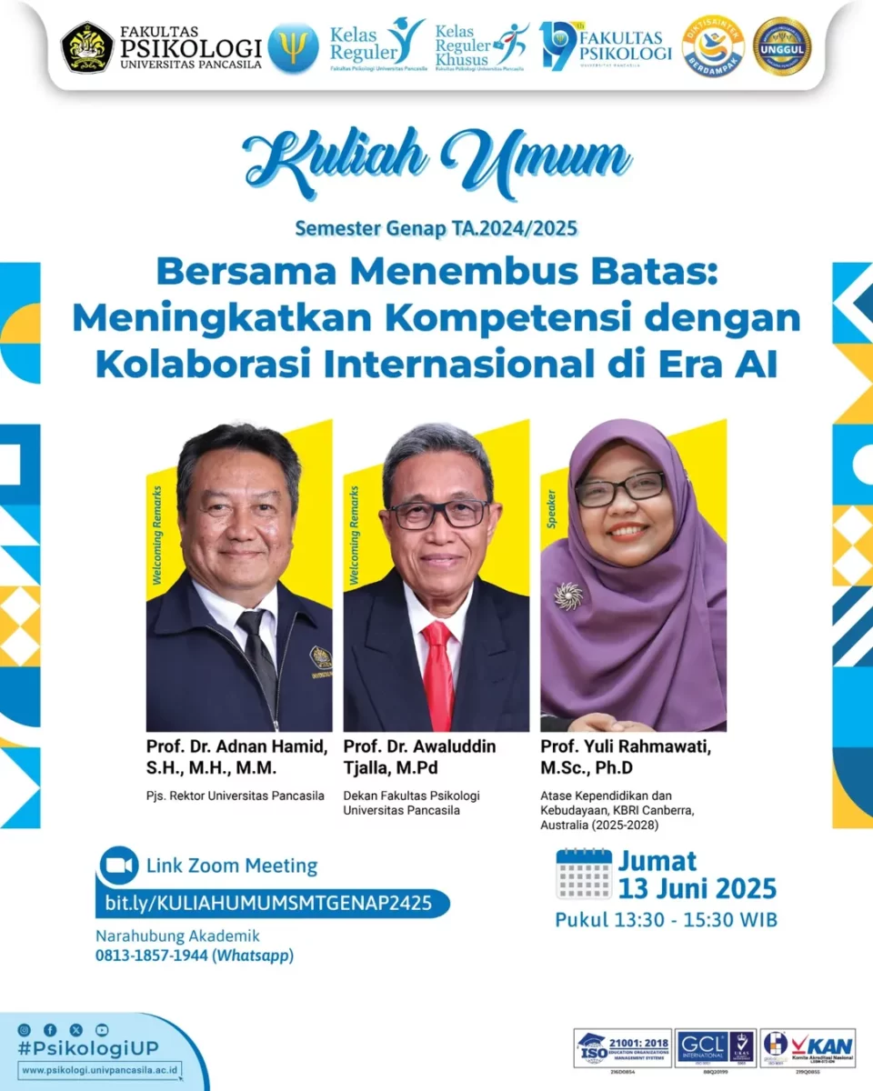 [KULIAH UMUM SPESIAL 19th FPSI UP] “Bersama Menembus Batas: Meningkatkan Kompetensi dengan Kolaborasi Internasional di Era AI” Siap jadi insan psikologi berkelas dunia? Yuk, ikuti kuliah umum yang akan membuka cakrawala baru! ️ Narasumber Utama: Prof. Yuli Rahmawati, M.Sc., Ph.D …