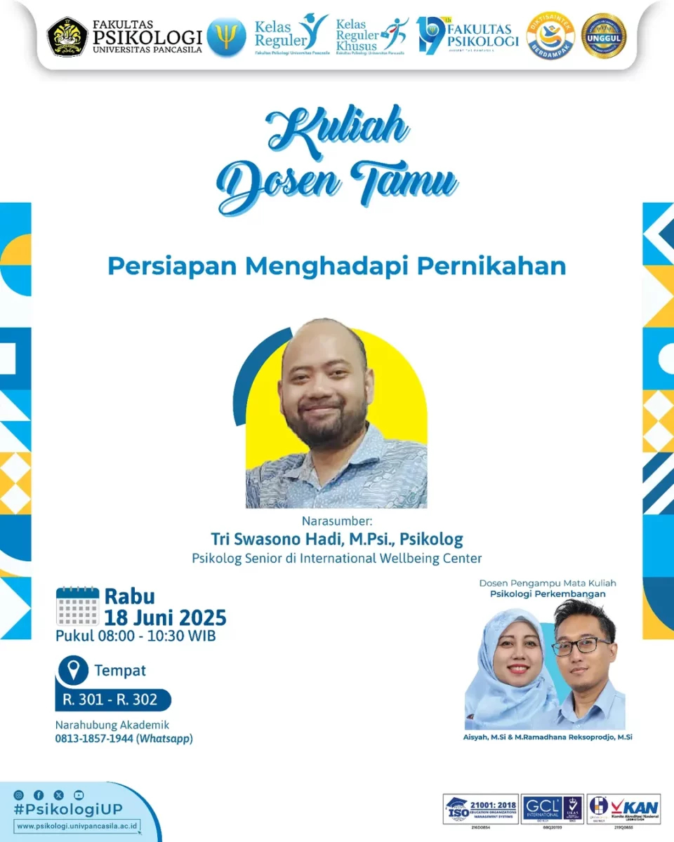 Hallo teman-teman #PsikologiUP khususnya untuk kamu yang mengambil Mata Kuliah Psikologi Perkembangan, Fakultas Psikologi Universitas Pancasila mengundang Tri Swasono Hadi, M.Psi., Psikolog., untuk membahas topik yang sangat menarik dan relevan: ”Persiapan Menghadapi Pernikahan” Tanggal: Rabu, 18 Juni 2025 ⏰ Waktu: Pukul 08.00 …