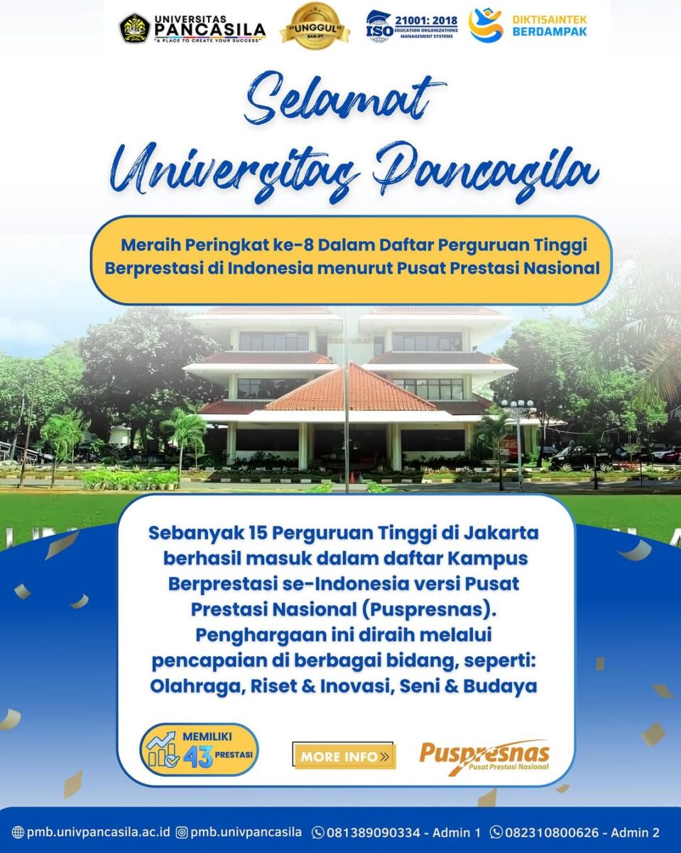 Universitas Pancasila meraih peringkat ke-8 sebagai Perguruan Tinggi Berprestasi se-Indonesia versi Pusat Prestasi Nasional (Puspresnas).