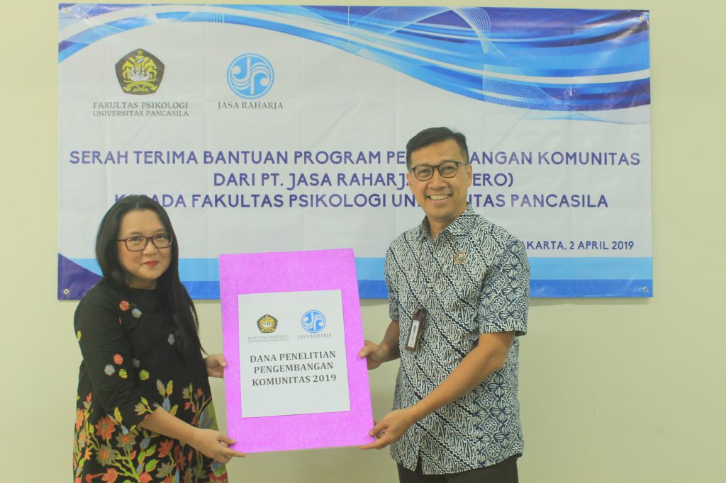 Serah terima bantuan program pengembangan komunitas dari PT. Jasa Raharja kepada Fakultas Psikologi Universitas Pancasila pada Selasa, 2 April 2019.