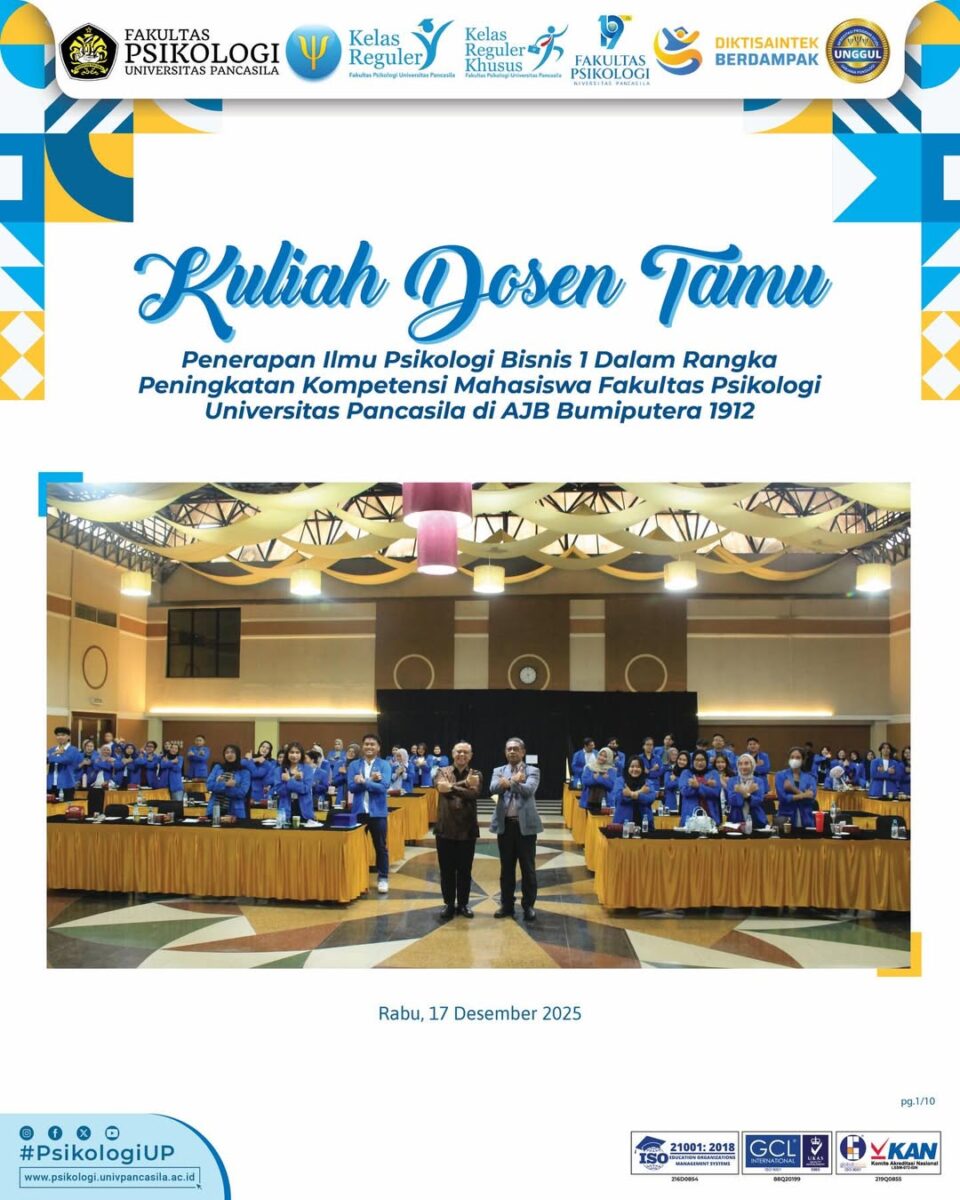 Pada 17 Desember 2025, Fakultas Psikologi Universitas Pancasila (FPsi UP) menyelenggarakan Kuliah Dosen Tamu pada mata kuliah Psikologi Bisnis I bertema “Penerapan Ilmu Psikologi Bisnis I dalam Rangka Peningkatan Kompetensi Mahasiswa” di Hotel Bumi Wiyata, salah satu anak perusahaan AJB …