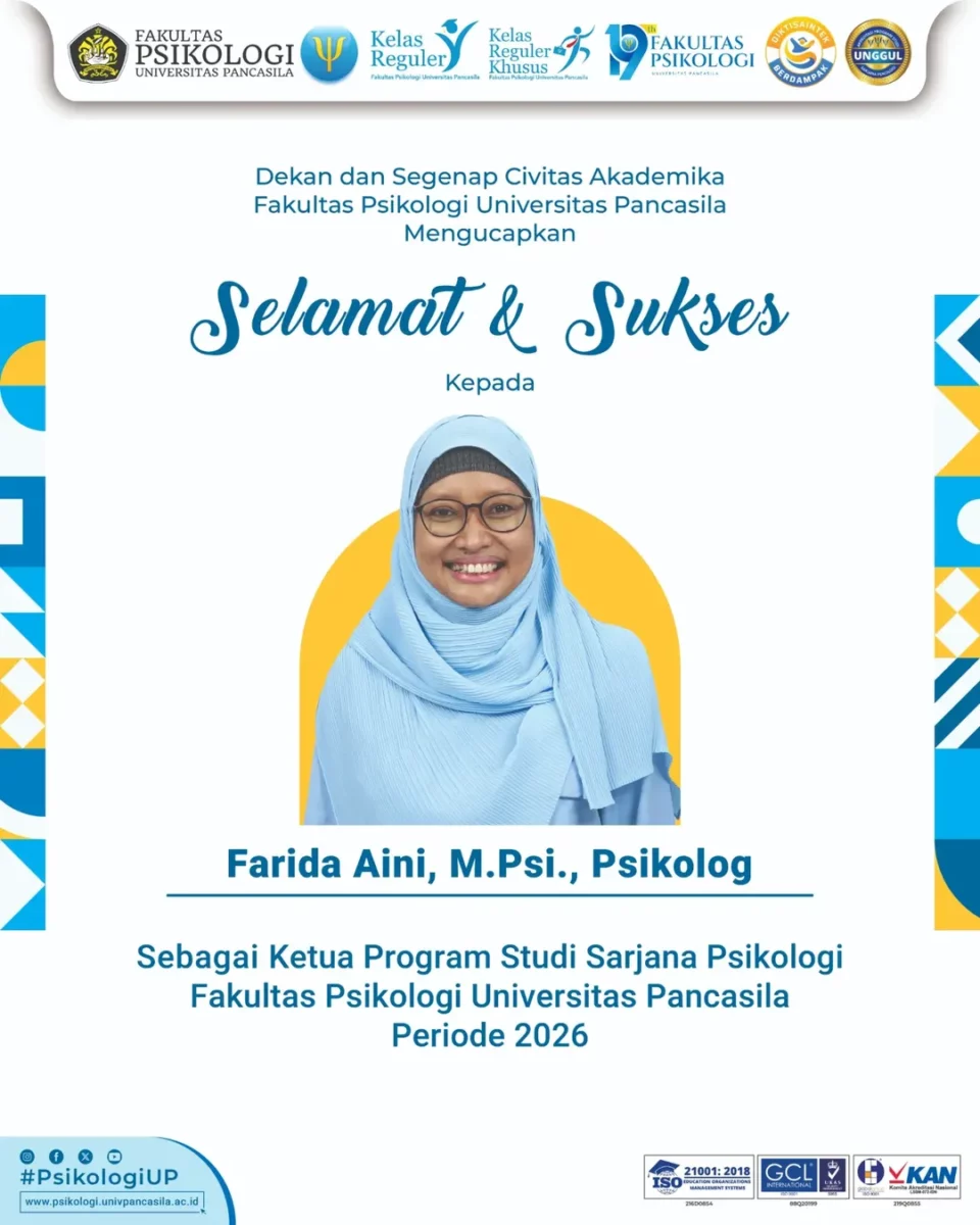 Dekan dan segenap Civitas Akademika Fakultas Psikologi Universitas Pancasila mengucapkan Selamat dan Sukses kepada Ibu Farida Aini, M.Si., Psikolog Atas amanah sebagai Ketua Program Studi Sarjana Psikologi Fakultas Psikologi Universitas Pancasila Periode 2026. Semoga senantiasa diberi kelancaran dalam menjalankan tugas …