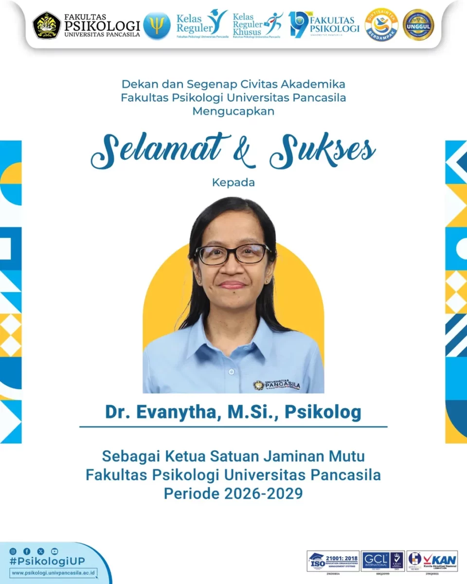 Dekan dan segenap Civitas Akademika Fakultas Psikologi Universitas Pancasila mengucapkan Selamat dan Sukses kepada Ibu Dr. Evanytha, M.Si., Psikolog Atas amanah sebagai Ketua Satuan Jaminan Mutu Fakultas Psikologi Universitas Pancasila Periode 2026–2029. Semoga senantiasa diberi kelancaran dalam menjalankan tugas serta …