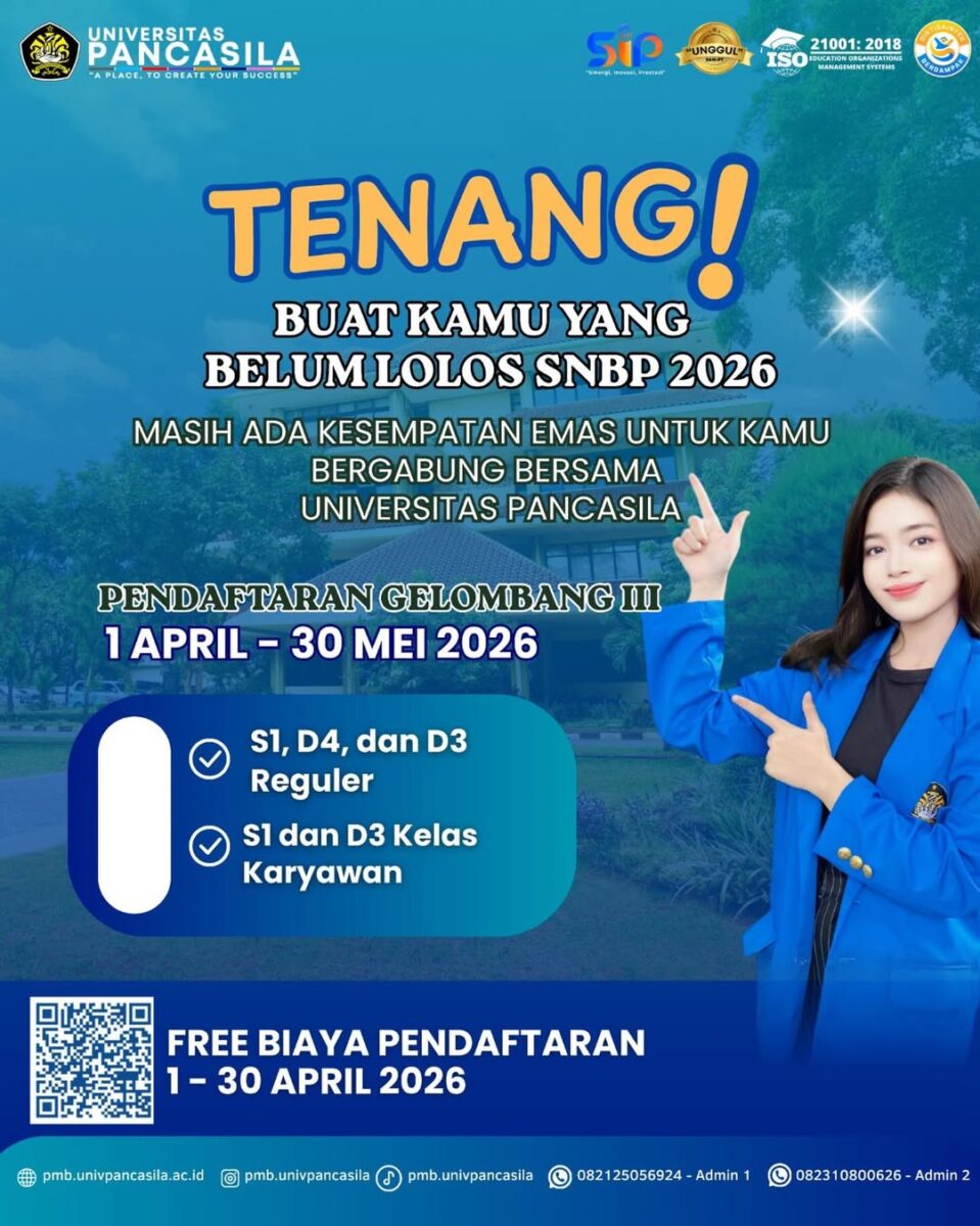 Buat kamu yang belum beruntung di SNBP 2026, jangan berkecil hati. Gelombang III Universitas Pancasila sudah dibuka! Amankan kursi kamu sekarang juga di salah satu kampus swasta terbaik. Program Tersedia: S1, D4, & D3 Reguler S1 & D3 Kelas Karyawan …