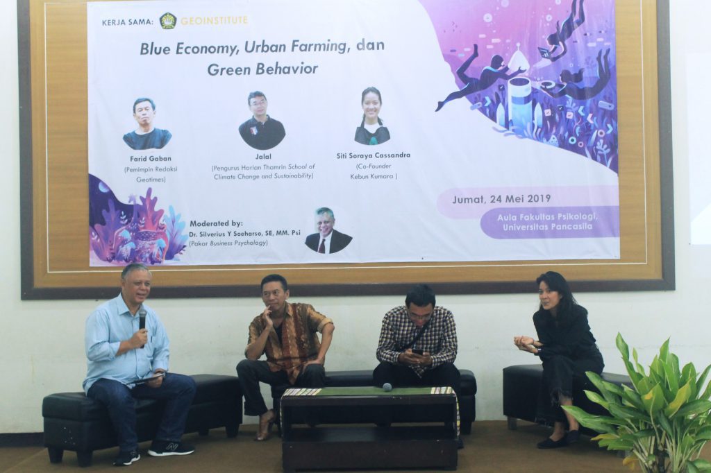 Pada Jum’at tanggal, 24 Mei 2019, Fakultas Psikologi Universitas Pancasila telah melaksanakan Buka Bersama bertajuk “Blue Economy, Urban Farming, dan Green Behavior”. Sebuah tema yang menarik terkait cara pandang kita terhadap lingkungan dan bagaimana proses dialog kita dengan alam selama ini. Program ini merupakan bentuk kerjasama dengan Geotimes berupa diskusi interaktif yang dipandu oleh moderator Dr. Silverius Y Soeharso, S.E, S.Psi, M.M dan tiga pembicara.