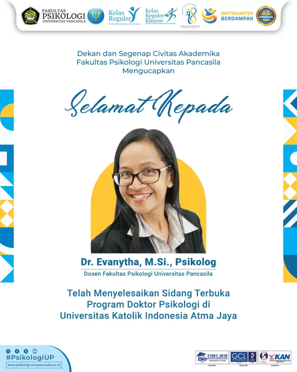 Selamat kepada Dr. Evanytha, M.Si., Psikolog (Dosen Fakultas Psikologi Universitas Pancasila)