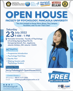Dalam acara ini, teman-teman bisa berkenalan lebih lanjut dengan Fakultas Psikologi Universitas Pancasila, berkeliling untuk mengetahui fasilitas di Fakultas Psikologi Universitas Pancasila, dan juga mencoba mengikuti Trial Class Fakultas Psikologi. Acara ini *GRATIS* dan sangat tepat untuk teman Putih Abu-Abu yang ingin mencoba langsung berkuliah di jurusan Psikologi di Universitas Pancasilla.