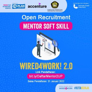 Fakultas Psikologi Universitas Pancasila & PLAN Internasional mengadakan pelatihan pengembangan softskill yang terbuka bagi mahasiswa dan umum. Kegiatan ini dilakukan sebagai wujud kerja sama yang dilakukan oleh Fakultas Psikologi Universitas Pancasila dan PLAN Internasional. Dalam mendukung berjalannya program ini, kami membuka lowongan untuk posisi MENTOR yang akan bertugas mengajarkan dan mendampingi partisipan selama program pelatihan berjalan. Lowongan ini dibuka untuk Dosen (tetap/tidak tetap) Fakultas Psikologi Universitas Pancasila, alumni Fakultas Psikologi Universitas Pancasila, dan masyarakat umum yang memiliki pengalaman kerja/bisnis (minimum 2 tahun).