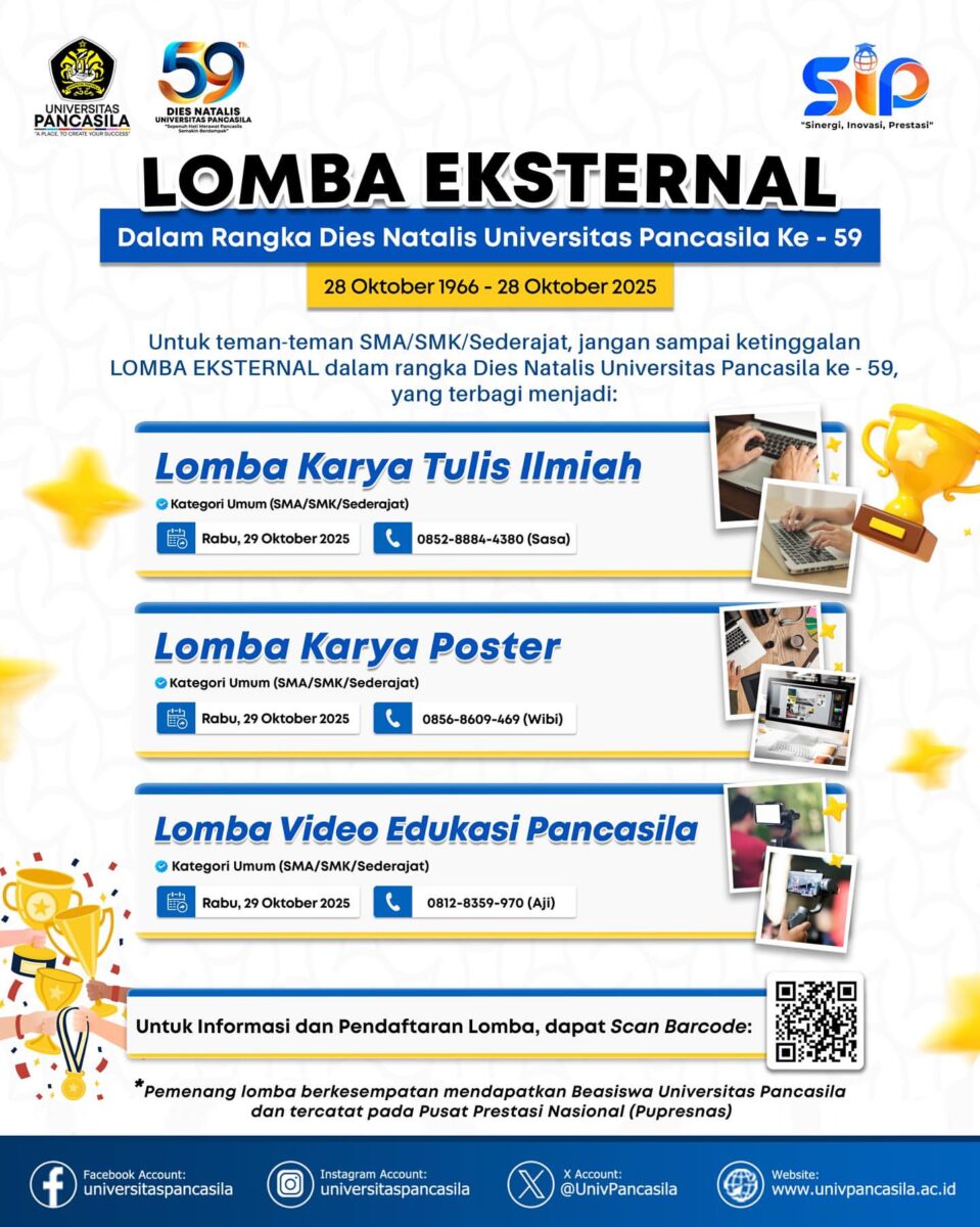 Jangan lewatkan kesempatan emas untuk ikut serta dalam Lomba Eksternal dalam rangka Dies Natalis Universitas Pancasila ke-59.