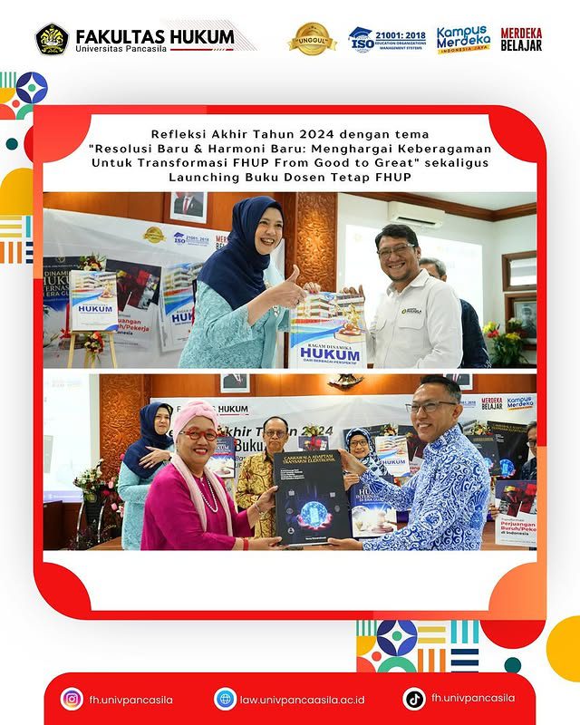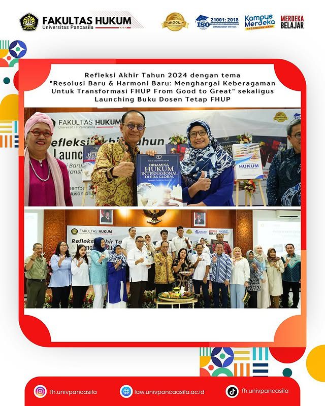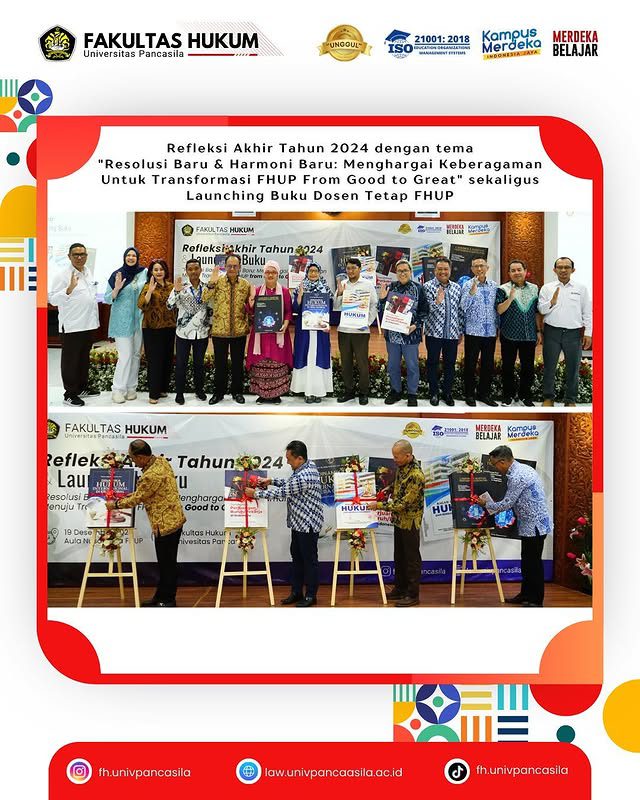 Fakultas Hukum Universitas Pancasila (FHUP) mengadakan acara Refleksi Akhir Tahun 2024 yang dirangkaikan dengan peluncuran empat buku baru hasil karya dosen dan mahasiswa. Acara bertema “Resolusi Baru, Harmoni Baru, Menghargai Keberagaman Menuju Transformasi FHUP From Good To Great” ini berlangsung di Aula Nusantara, Gedung Fakultas Hukum Universitas Pancasila.