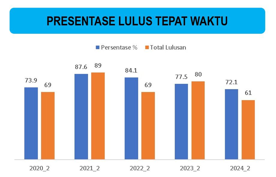 Data kelulusan pada empat periode terakhir menunjukkan persentase kelulusan tepat waktu pada kisaran 73% hingga 87%, dengan jumlah lulusan yang relatif stabil setiap tahunnya.