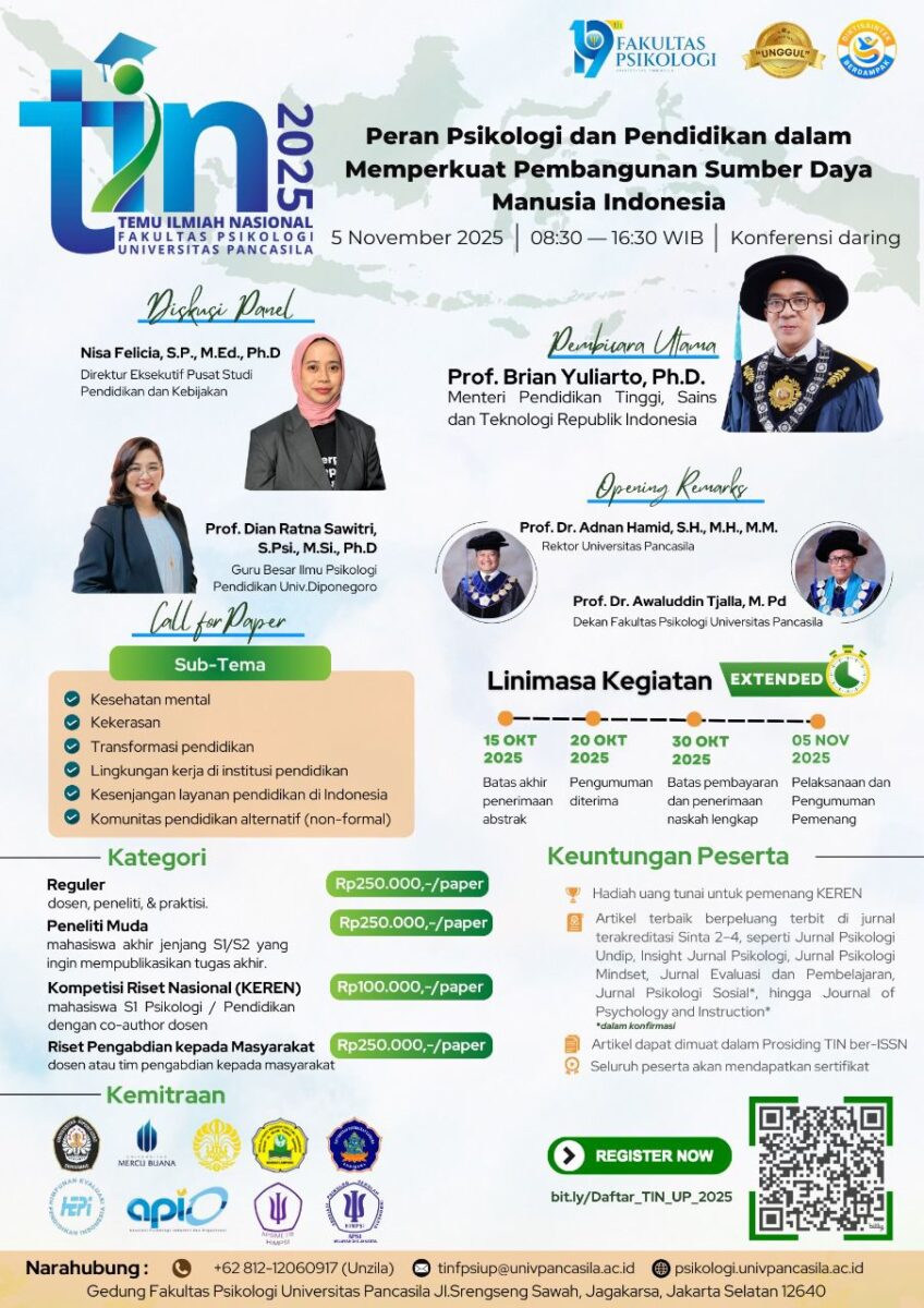 #TIN2025 #PsikologiUP #CallForPaper #SeminarNasional #PsikologiPendidikan #SDMIndonesia #FakultasPsikologi #UniversitasPancasila #AcaraOnline #KompetisiIlmiah